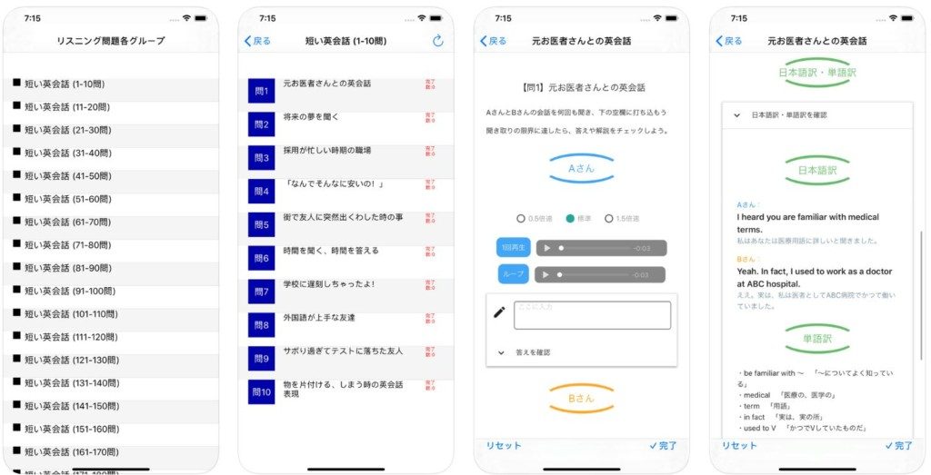 一文ずつディクテーションの練習が可能で、会話のスピードも調整できます。