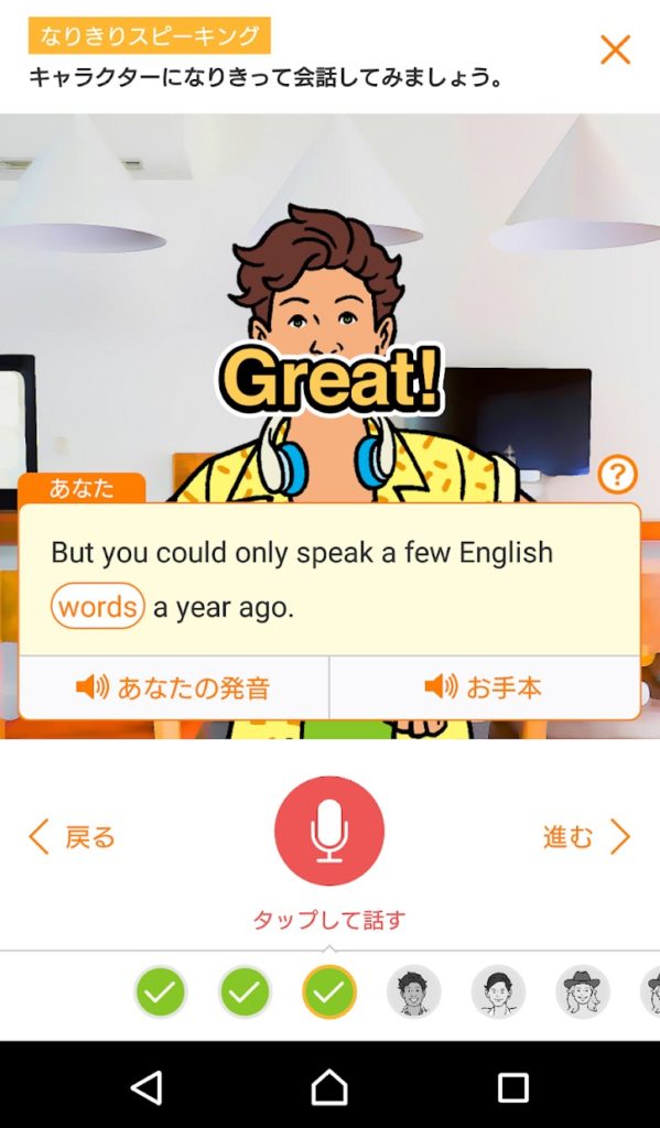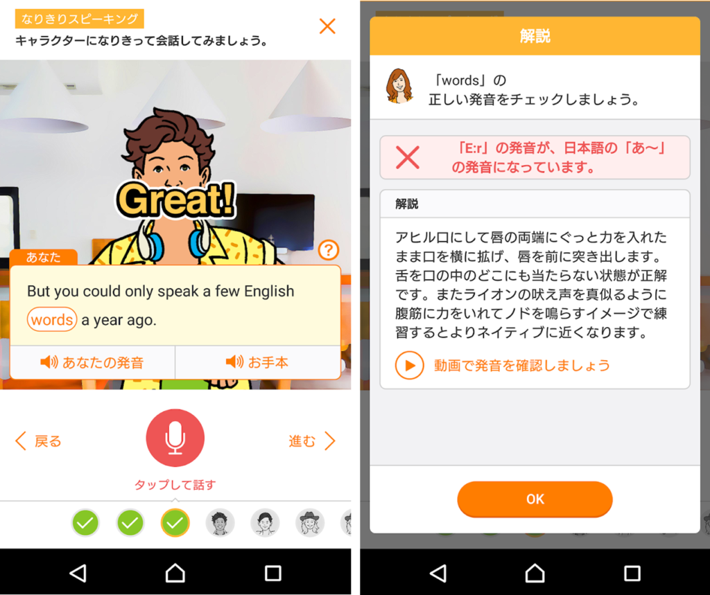 うまく発音できていれば「Great!・Good!」と表示され、間違っていると正しい発音の解説が出てきます。