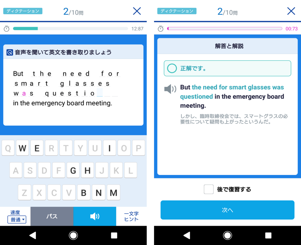 中でも優秀なのが、リスニング力アップになるディクテーション機能です。