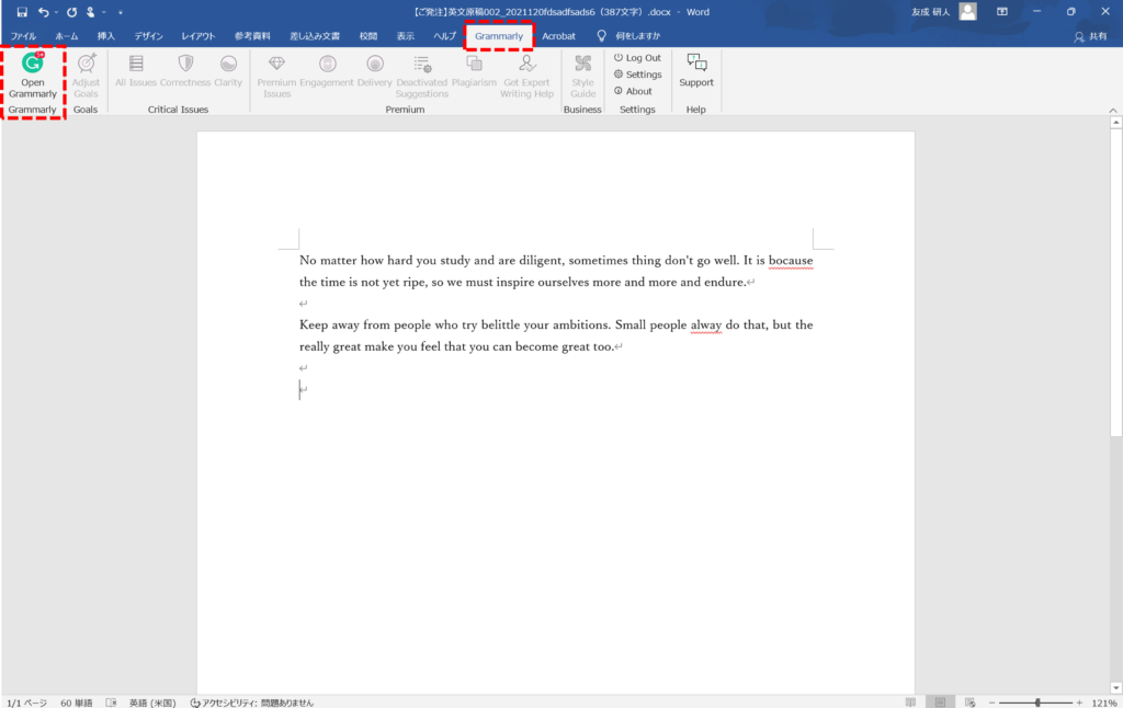 そのため使い方はとても簡単で、Wordを開いて"Grammarlyの機能をオンにする"だけでOKです。