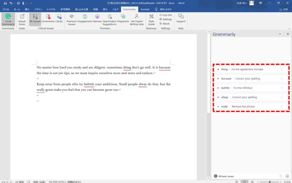 このようにGrammarlyは、普段から"Wordを使って英語の文章を書いている方"でも有効活用ができて