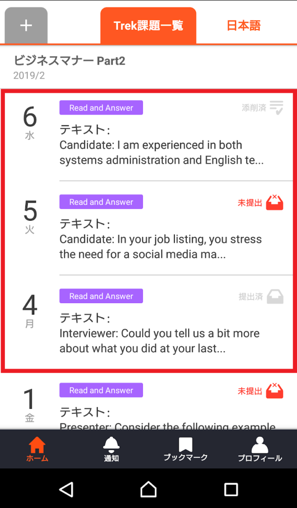 提出した課題は「添削済」となるのですが、今回受講したビジネスコースでは【Read & Answer】という