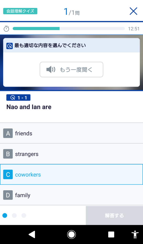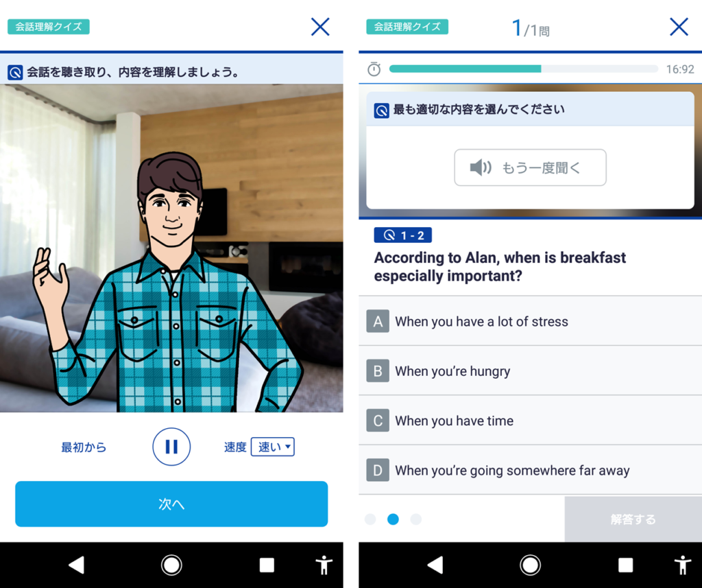 そしてレッスンがスタートすると、最初に音声を聴いて問題に答えるクイズが出題されます。