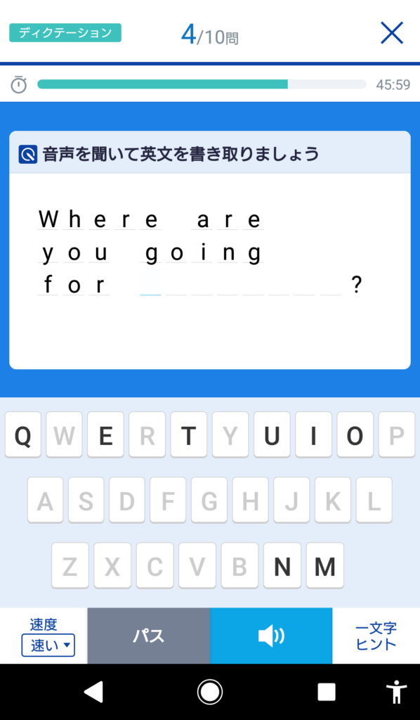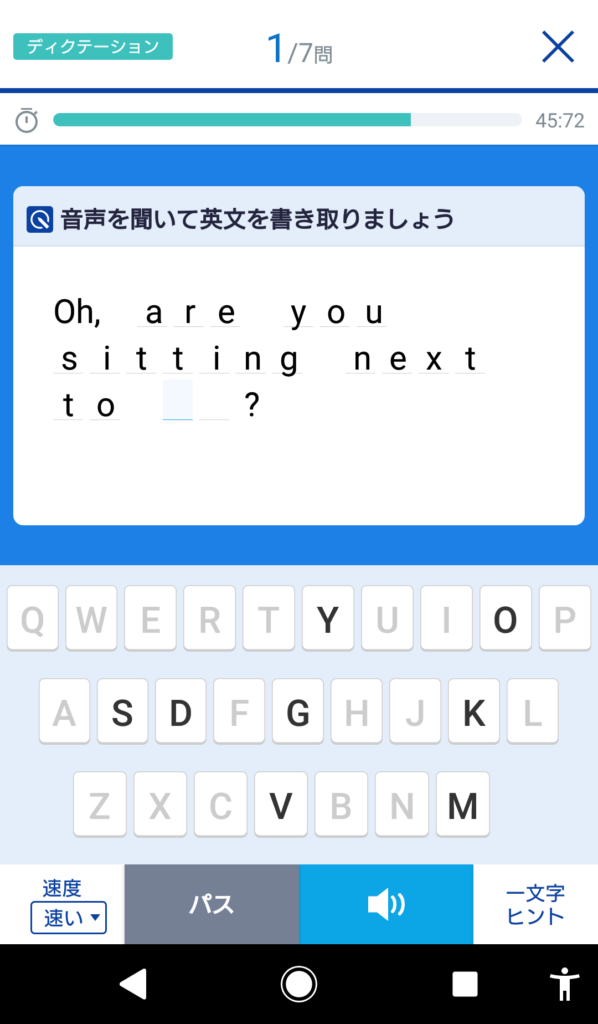 ディクテーションしてる時に、それでもスペルが分からなかければ「一文字ヒント」ボタンを押します。
