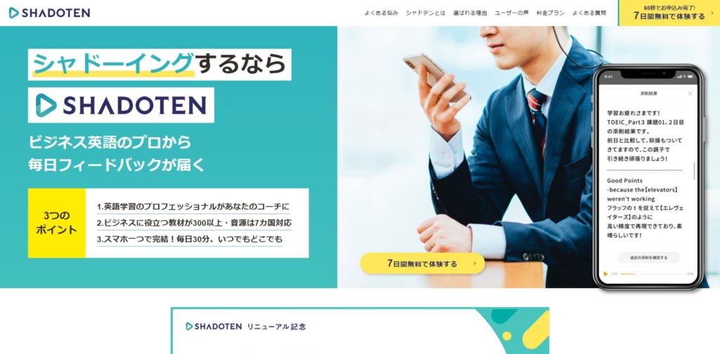 続いてビジネス英をご身につけたい社会人の方であれば、PROGRITの>>『シャドテン』がおすすめ。